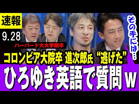 経済、外国人問題など5人が政策を訴える中、ひろゆき氏の“暴走”は止まらない。「What kind of country do you want Japan to be?Could you explain in English in one minute?(日本をどんな国にしたいか、1分以内で英語で説明してください)」と突然、英語で質問。ともに米ハーバード大大学院卒の林芳正官房長官と茂木敏充前幹事長は英語で回答し、語学力をアピール。ハーバードに並ぶ名門コロンビア大大学院を修了している小泉氏の対応に注目が集まったが「ひろゆきさんの提案に乗ってはいけない。日本語で答えます」と英会話は披露せず。ひろゆき氏は「ひと言も(英語を)言わない。大和魂的な」と、してやったりの表情だった。