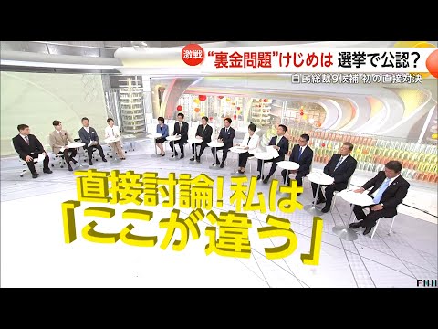 12日放送のフジテレビの報道番組「イット!」にはこの9人の候補者全員が生出演し、初めての直接対決に臨んだ。